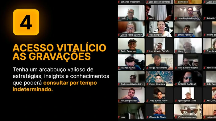 Além das sessões ao vivo, você terá acesso à área de membros, onde estarão disponíveis todas as gravações, materiais de apoio e recursos adicionais.